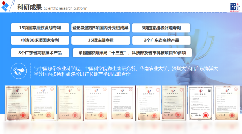 截至目前,公司累計承擔國家重點研發(fā)計劃 “藍色糧倉” 專項、國家海洋局 “十三五” 專項等國家及省市科研項目 30 余項,獲授權國家專利 30 余項(其中發(fā)明專利 17 項) ,主導制定 3 項團體標準,擁有肥料登記證近 20 個,產品通過有機認證、綠色認證,并獲評 “國家重點新產品”“廣東省知名品牌”。